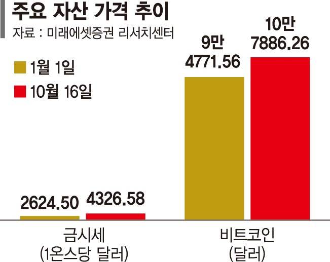 19일 파이낸셜뉴스가 미래에셋증권 리서치센터에 의뢰해 집계한 올해 주요 자산군별 투자 수익률(1월 1일~10월 16일)에 따르면 금과 비트코인 가격은 각각 64.9%, 13.8% 상승했다. 코스피지수(56.2%)와 스탠더드앤드푸어스(S&P)500(12.7%)을 비롯해 일본(21.0%), 중국(16.8%), 유럽(15.4%) 등 주요 증시도 높은 수익률을 기록했다. 반면 주요 6개 법정통화 대비 달러 가치를 나타내는 달러인덱스(DXY)는 98선에 머물러 있다. 연초 110을 넘어섰던 것과 비교하면 10% 가까이 떨어진 수치다.