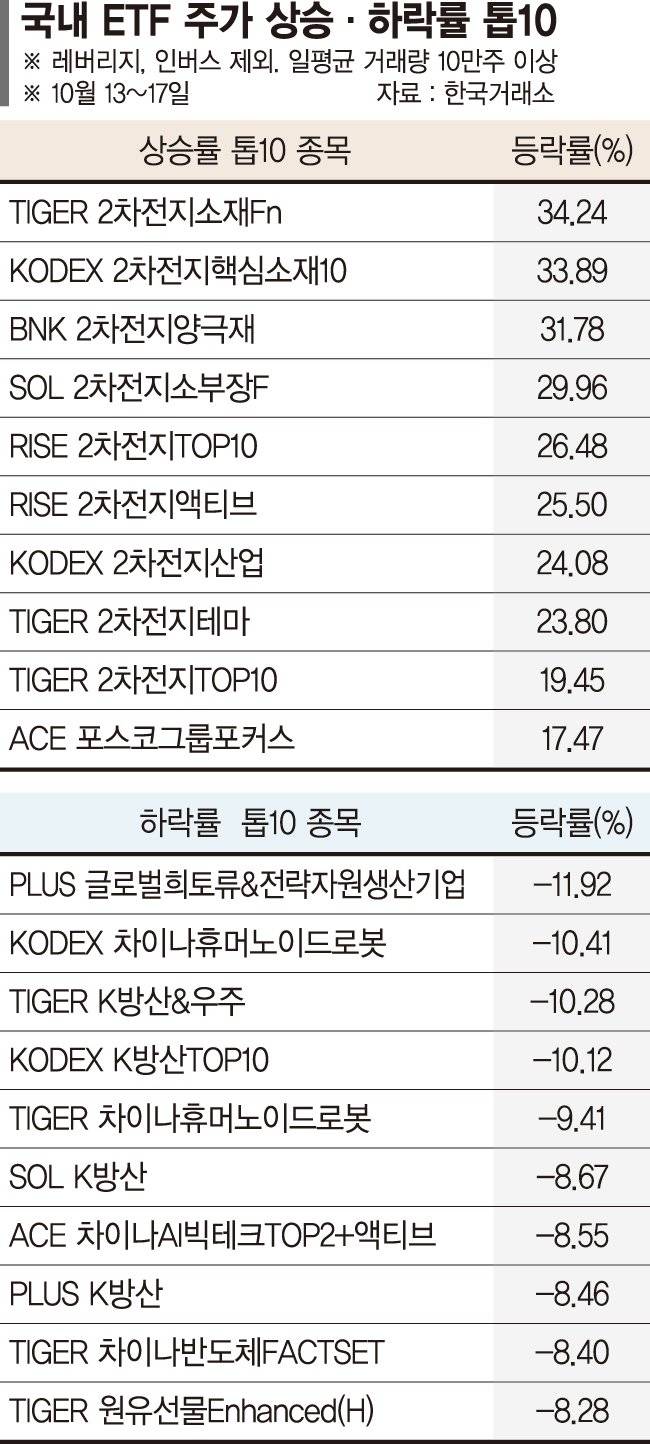 19일 한국거래소가 집계한 ETF 수익률에 따르면 지난 13일부터 17일까지 ETF 시장에서 가장 높은 수익률을 기록한 상품은 'TIGER 2차전지소재Fn'(34.24%)으로 한 주만에 30% 이상 급등했다. 이어 'KODEX 2차전지핵심소재10'(33.89%), 'BNK 2차전지양극재'(31.78%), 'SOL 2차전지소부장Fn'(29.96%), 'RISE 2차전지TOP10'(26.48%) 등이 뒤를 이었다. 상위 10개 ETF 중 9곳이 이차전지 테마로 채워지며 배터리 밸류체인 전반의 강세가 두드러졌다.