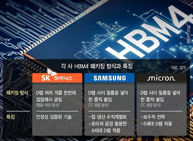 하이닉스는 검증된 기술을 사용한다는 점을 앞세운다. 하이닉스는 칩 여러 개에 고열을 가하며 그사이에 액체를 넣어 한꺼번에 굳히는 엠알-머프(MR-MUF) 접합 기술을 쓴다. 앞서 5세대 제품에도 같은 패키징 방식을 통해 수율(양품 비율)과 성능을 안정적으로 관리했던 만큼, 점진적 기술 개선을 통해 삼성과 마이크론 제품을 뛰어넘는 성능을 발휘할 수 있다는 것이다.