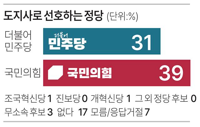 [6·3지방선거 도민 여론조사] 차기 도지사 선호 정당, 국힘 39% 민주 31%