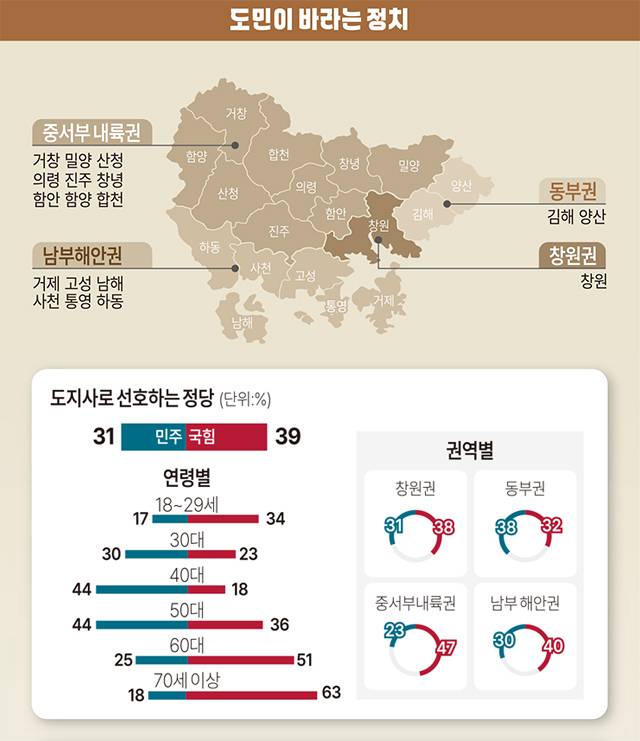 지역별로 국민의힘 후보가 경남도지사로 당선됐으면 하는 도민은 거창·밀양·산청·의령·진주·창녕·함안·함양·합천 등 중서부 내륙권이 47%로 가장 많았고, 거제·고성·남해·사천·통영·하동 등 남부 해안권이 40%, 창원권 38%, 김해·양산 등 동부권 32% 순이었다.