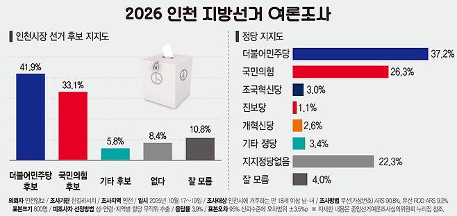 [2026 지방선거 여론조사] 인천 민심, 여전히 민주당…국힘 반등은 '제자리'