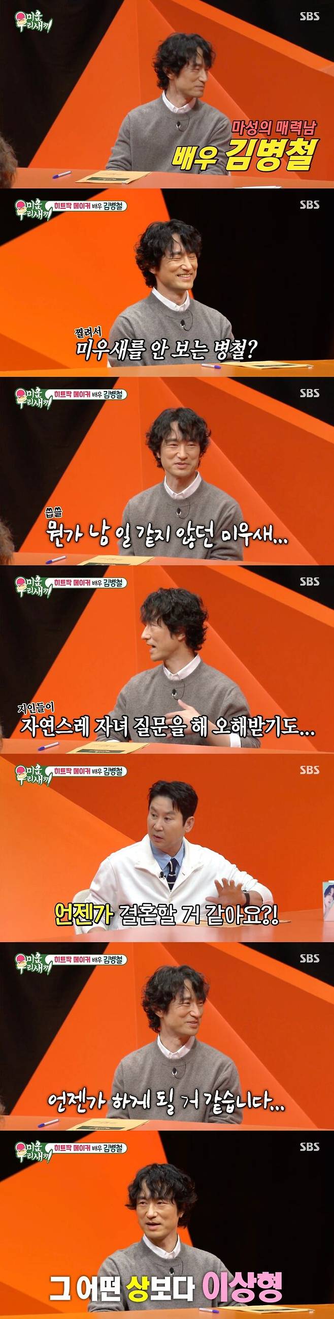 이를 듣던 신동엽은 "계속 혼자 있을 거 같냐, 언젠가 결혼을 하게 될 거 같냐?"라고 물었다. 그러자 김병철은 "언젠가 할 거 같다"라고 했고 어떤 상 보다도 이상형과의 결혼이 더 중요하다고 말했다.