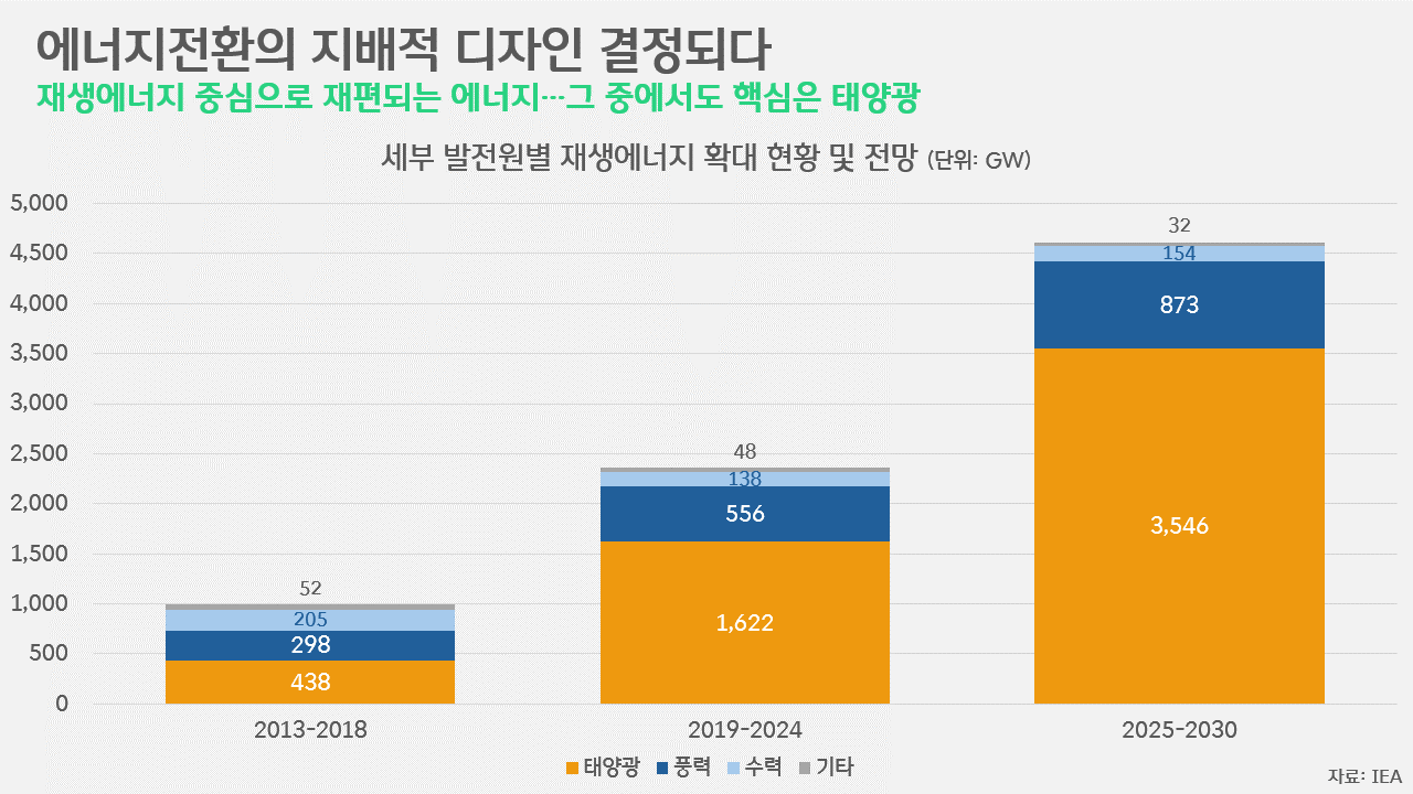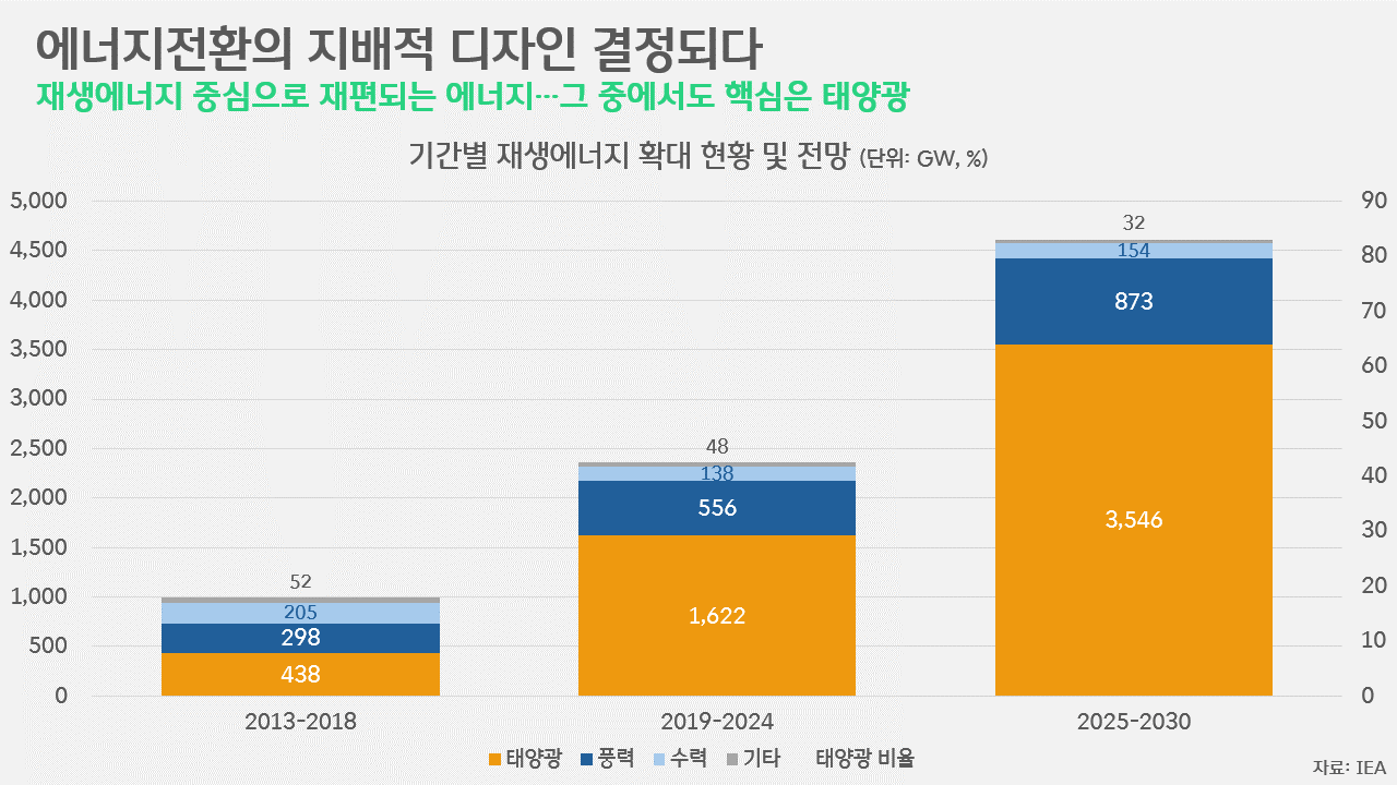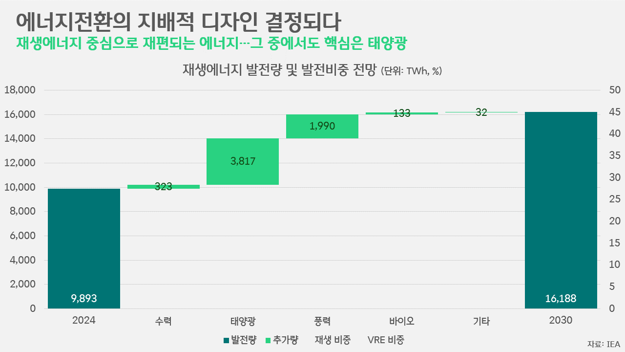 2024년 기준, 전 세계 전력 생산에서 재생에너지가 차지하는 비중은 32%에 달했습니다. VRE(Variable Renewable Energy, 변동성 재생에너지)로 불리는 태양광과 풍력의 비중만도 이젠 15%에 달하죠. VRE를 중심으로 세계 각지에서 발전설비가 폭발적으로 증가하면서 글로벌 에너지전환의 판도는 전기화와 그 전기의 재생에너지화로 굳어졌습니다. 세계 각국에서 벌어지는 각종 정치적 이슈나 선거 등과 관계없이, 집권 정당의 성향과 관계없이, 거스를 수 없는 '지배적 디자인'이 된 겁니다.