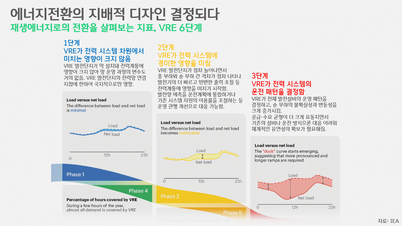 ③ VRE가 전력 시스템의 운전 패턴을 결정함: VRE의 비중이 늘어나 순 부하의 불확실성과 변동성이 크게 늘어나며, VRE가 전체 발전설비의 운영 패턴을 결정하기에 이름. 전력의 공급과 수요의 격차가 더 크게 요동치면서 기존의 설비로는, 기존의 운전 방식으로는 대응하기 어려워짐. 이에 체계적인 유연성 확보가 필요해지는 단계.
