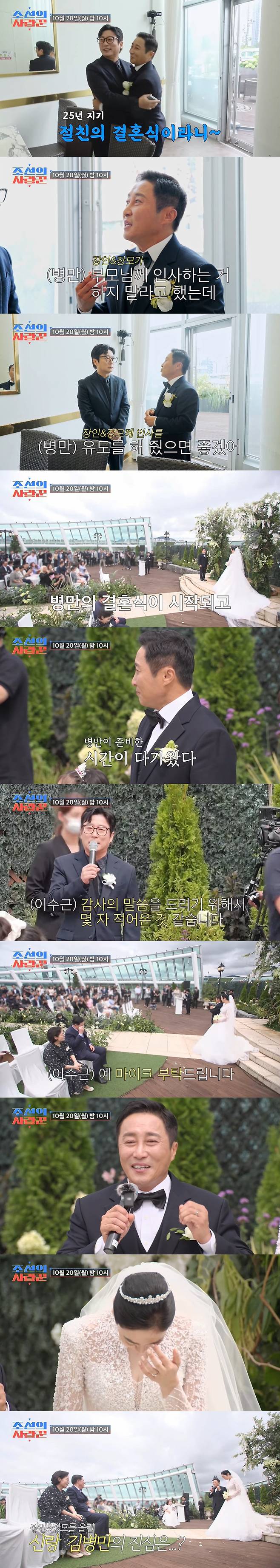 영상 속에는 김병만의 결혼식 모습이 담겼다. 김병만은 결혼식 시작 전 사회를 맡은 25년지기 절친 이수근을 찾아갔고, 이수근은 "이런 날이 온다"며 김병만을 안아주며 축하를 건넸다.