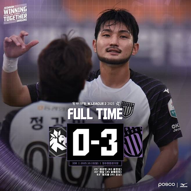 전남은 지난 19일 오후 청주종합경기장에서 열린 하나은행 K리그2 2025 35라운드 원정 경기에서 충북청주를 3-0으로 완파했다.