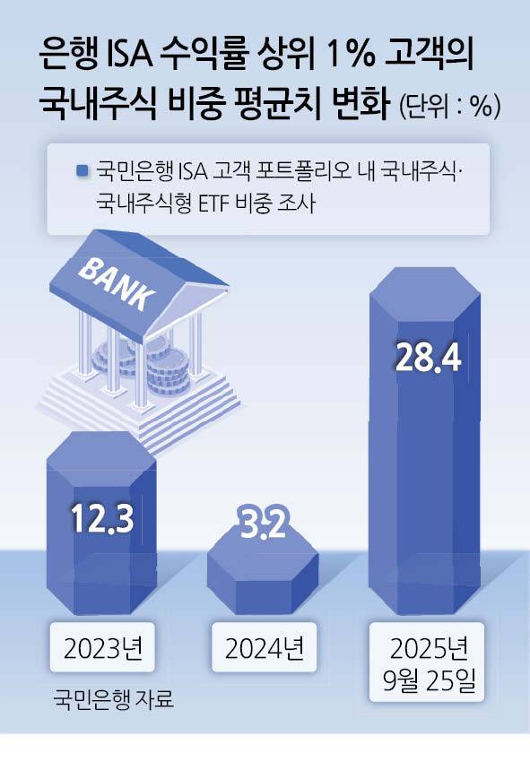 전체 ISA 고객의 국내 주식 비중이 1%에도 못 미치는 점을 고려하면, 상위 투자자들의 움직임은 더욱 두드러진다. 지난해 ‘국장 탈출은 지능순’이라는 말이 나올 정도로 시장이 부진하자 ISA 고수들도 2023년(12%)에서 2024년(3.16%)까지 국내 주식 비중을 대폭 줄였지만 올 들어 30% 돌파를 앞두며 빠르게 복귀했다. 지난해 해외 ETF와 예·적금 비중을 줄이고 국내 주식으로 대거 자금을 옮긴 결과다.