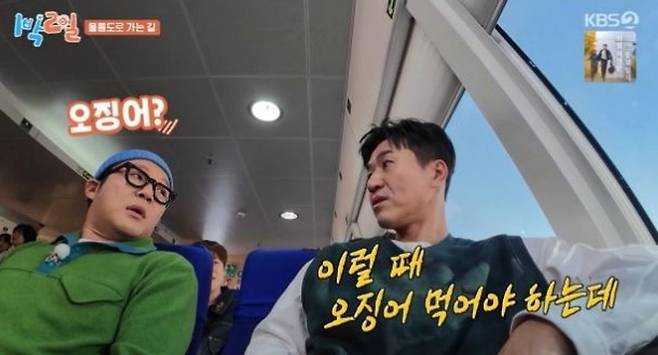 한편 여행에 당첨되지 않은 김종민, 조세호, 딘딘, 유선호는 동해 묵호항에서 울릉도로 향하며 출발하자마자 멀미를 경험했다. 특히 김종민이 뱃멀미 극복을 위해 '오징어를 먹어야 한다'고 말하며 분위기를 띄우기도 했다. 또한, 전날 출발한 문세윤과 이준의 행적을 맞히는 퀴즈를 진행하여 팀워크를 다졌다.