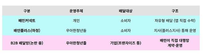 둘째, '배민플러스'는 자회사인 우아한청년들이 전국 지사를 통해 라이더를 모집·관리하는 하청형 구조다.