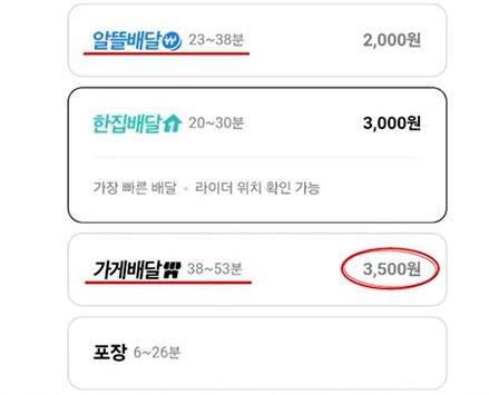 | ▲ 배민의 배달대행사 밀어내기 배민은 이미 지난 4월 구조 개편을 단행, ‘알뜰배달(배민 자체)’은 싸고 빠르게, ‘가게배달(외부 대행사)’은 비싸고 느리게 표시됐다. |