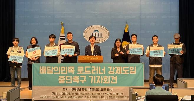 | ▲ 라이더유니온, 우아한유니온, 공플협 연대 기자회견 사진 2025년 10월 14일 국회 소통관에서 열린「배달의민족 로드러너 강제도입 중단 촉구 기자회견」 가운데 연단에는 한창민 국회의원이 발언 중이다. |