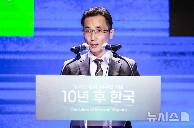 [서울=뉴시스] 정병혁 기자 = 임지윤 HD현대중공업 기본계획부서장이 20일 서울 용산구 드래곤시티호텔에서 열린 뉴시스 창사 24주년 기념 '10년 후 한국' 포럼 차세대 기술 리더상 시상식에서 해양수상부장관상을 수상한 뒤 기술 발표를 하고 있다. 2025.10.20 jhope@newsis.com