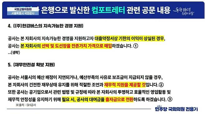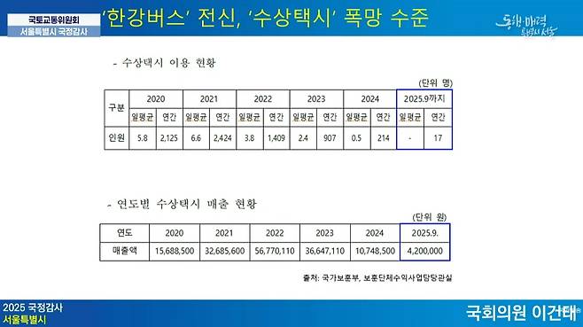 | ▲ 서울시 국정감사에서 전용기 민주당 의원이 제기한 한강버스 특혜 의혹 |