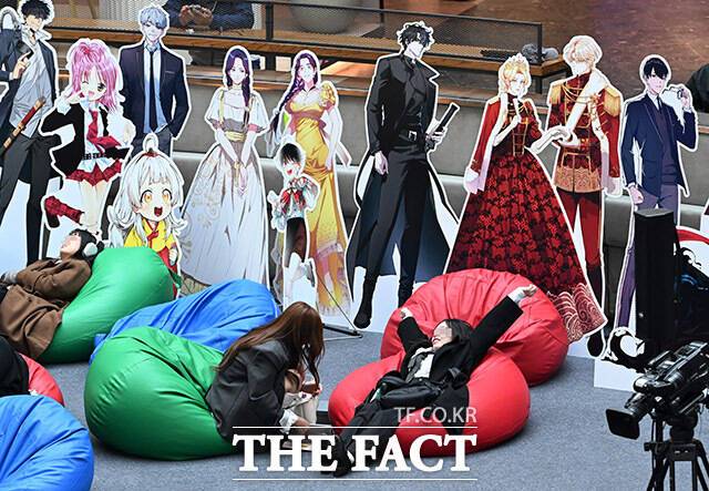 '2025 월드 웹툰 페스티벌'이 20일 오후 서울 송파구 롯데월드 아이스링크에서 열린 가운데 관람객들이 전시를 살펴보고 있다.