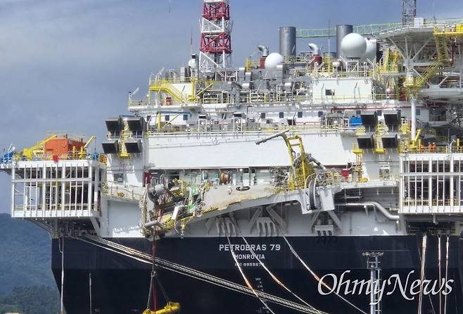 | ▲ 한화오션 거제 조선소 내 선박에서 추락 사고가 발생했다. 사진에서 보면 선박의 앞 부분 구조물이 일부 아래로 내려 앉아 있다. |