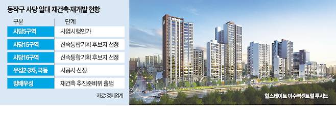 기축 단지가 많은 이수역 북측 지역에서도 새 아파트 공급이 여럿 대기 중이다. 국립서울현충원 자락에 있는 사당17구역(사당동 63의 1 일대)엔 최고 23층, 850가구가 들어선다. 우성2·3단지와 극동, 신동아4차는 리모델링을 추진 중이다. ‘우극’(우성2·3단지, 극동)은 올 5월 포스코이앤씨를 시공사로 선정했다. 기존 3485가구 규모인 우극은 4000가구 대단지로 탈바꿈한다. 신동아4차와의 통합 리모델링 가능성도 남아 있다.