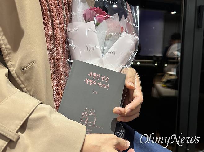 | ▲ 10.29 이태원 참사 희생자 고 신애진씨의 참사 후 세 번째 생일파티 겸 그의 아버지 신정섭씨의 책 출판 기념 북토크 행사가 지난 18일 서울 성동구 헤이그라운드에서 열렸다. 이날 드레스코드는 생전 고인이 좋아했던 분홍색이었다. 한 참석자가 분홍색 꽃과 책을 들고 온 모습. |