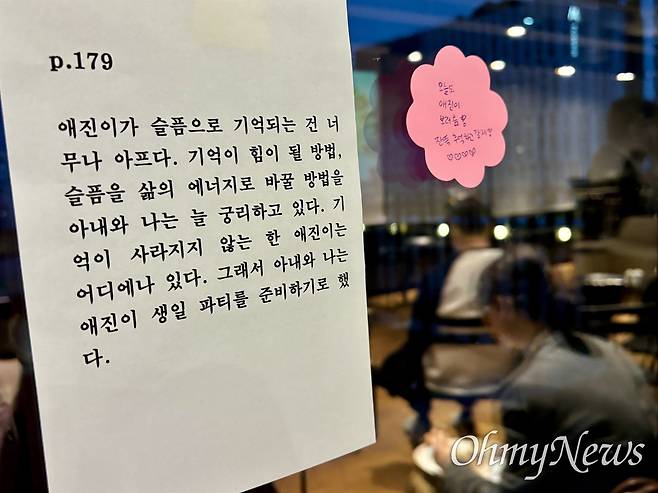 | ▲ 10.29 이태원 참사 희생자 고 신애진씨의 참사 후 세 번째 생일파티 겸 그의 아버지 신정섭씨의 책 출판 기념 북토크 행사가 지난 18일 서울 성동구 헤이그라운드에서 열렸다. 한 참석자가 "오늘도 애진이를 추억하기 위해 보러 왔다"는 메모를 벽면에 남겼다. |