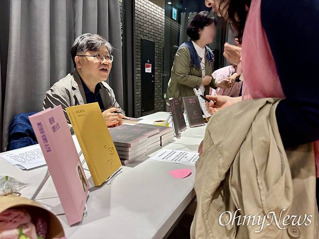 | ▲ 10.29 이태원 참사 희생자 고 신애진씨의 참사 후 세 번째 생일파티 겸 그의 아버지 신정섭씨의 책 출판 기념 북토크 행사가 지난 18일 서울 성동구 헤이그라운드에서 열렸다. 신정섭씨가 참석자들에게 사인을 하며 말을 건네고 있다. |