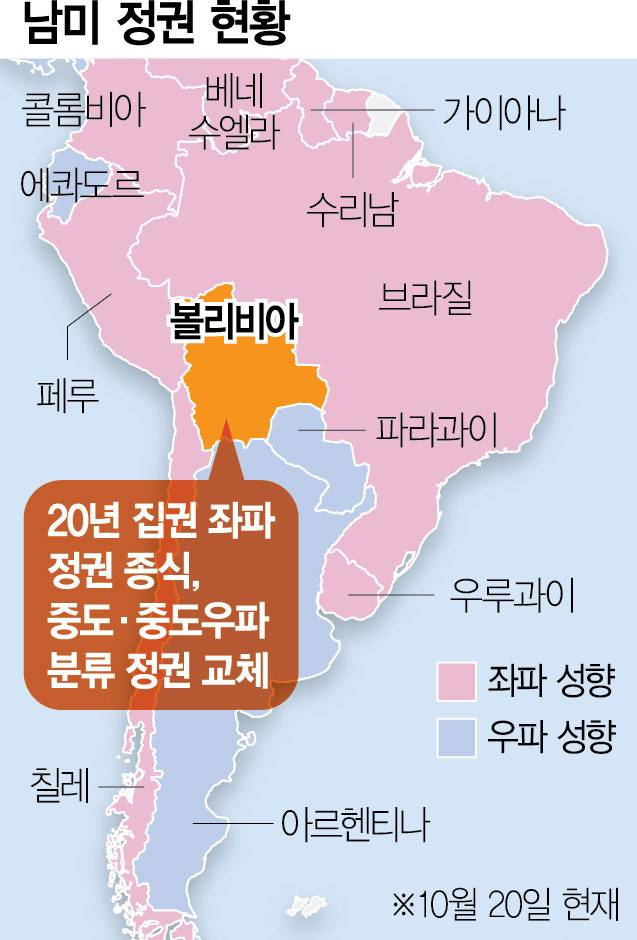 남미 볼리비아에서 약 20년 동안 장기 집권했던 좌파가 중도 우파에 정권을 내줬다. 경제난과 민심 이반이 심각한 중남미에서 ‘핑크 타이드(온건 좌파 정부의 득세)’가 속속 뒤집히고 있다는 분석이 나온다.