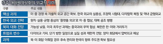 주요국 간 양자 회담에 이목이 쏠려 있지만, 다자회의인 에이펙의 본질에 집중하며 이를 활용할 기회를 보는 것이 한국으로서는 중요한 전략이라는 지적도 있다. 이상현 세종연구소 수석연구위원은 “트럼프 대통령의 짧은 방한 일정은 에이펙보다 자신 중심의 메시지 발신을 위한 것으로 해석되고, 한·미 회담이 열려도 실질 협력보다 한국을 압박할 수단이 될 가능성이 높다”고 진단했다. 무엇보다 관세·투자 문제라는 핵심 갈등 요인이 남아있다. 한국은 에이펙 주최국으로서 ‘역내 다자협력’에 충실한 모습을 보이는 것이 바람직하다는 제언이다. 트럼프 대통령에 대해서는 ‘에이펙 본회의 불참’보다 한국을 고려해 방한을 결정했다는 점에 외교적 의미를 둬야 한다는 분석이 제기된다. 반 교수는 “트럼프 대통령이 다자무대를 기피하는데도 한국에 오는 것 자체가 의미가 있고, 이를 실익으로 연결하려면 정상들의 공동선언 메시지에 참여하게 해야 한다”고 말했다. 한·미 정상회담을 통해 경주선언에 대한 트럼프 대통령의 간접적 동조를 유도해야 한다는 것이다.