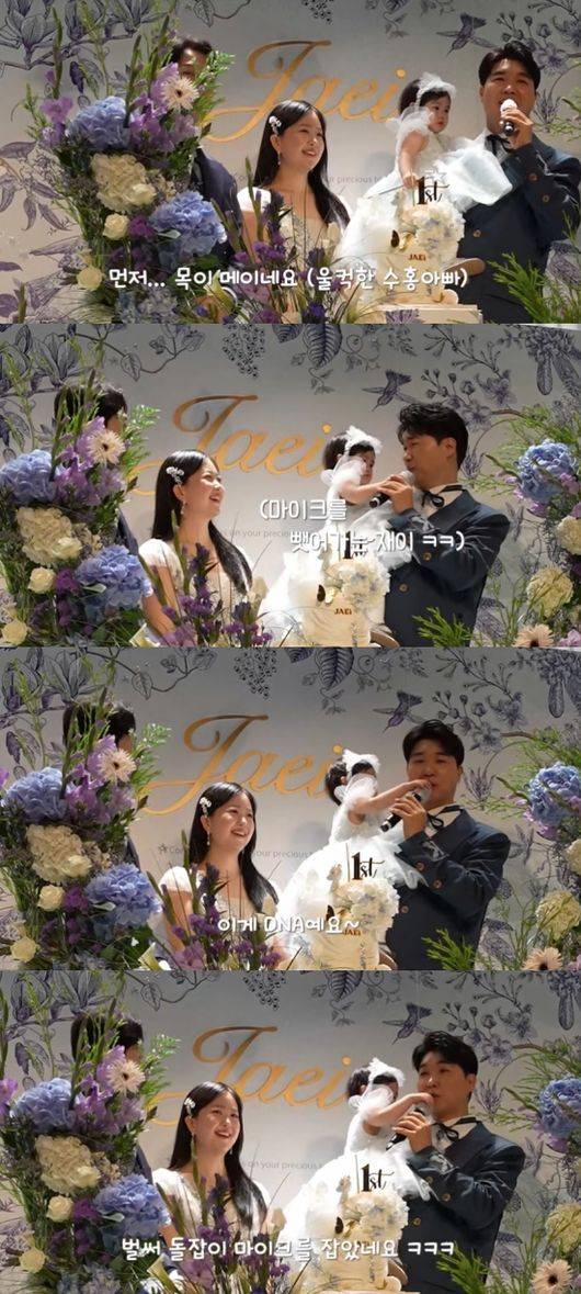 박수홍이 마이크를 잡고 이야기를 하자 딸은 마이크를 당겨 자신의 쪽으로 가져가려 했고, 이에 박수홍은 “기적이다. 이게 DNA다. 벌써 돌잡이 마이크를 잡았다”라고 너스레를 떨었다.