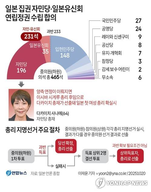 (서울=연합뉴스) 이재윤 기자 = 일본 집권 자민당과 제2야당 일본유신회가 20일 연립정권 수립에 정식 합의하면서 자민당 다카이치 사나에 총재가 오는 21일 일본 사상 첫 여성 총리로 취임하게 됐다.