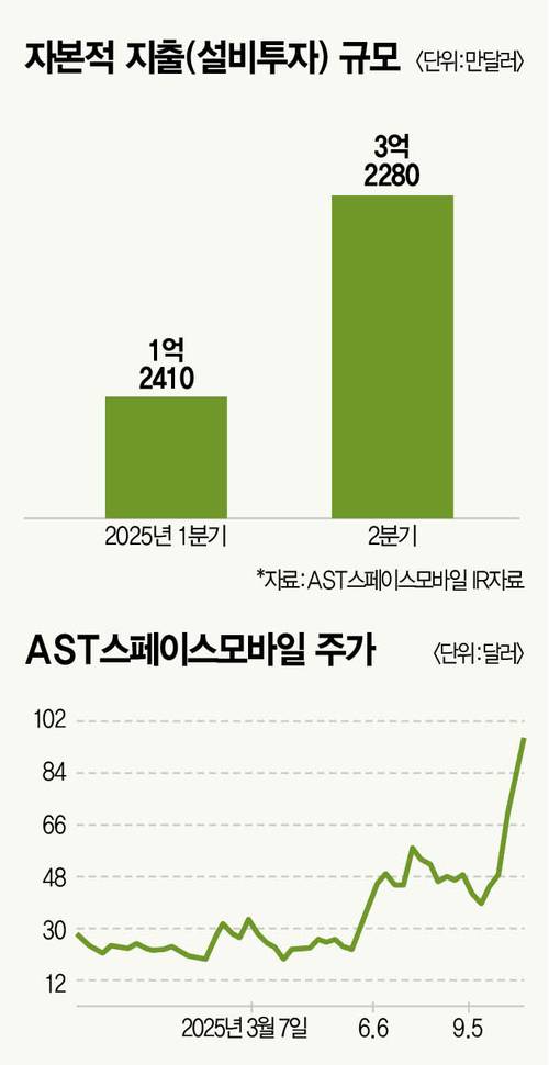 아직까지 매출은 크지 않다. 올해 2분기 스페이스모바일 매출은 115만달러(약 16억원)에 그쳤다. 반면 위성망 구축 등에 써야 할 돈은 수천억원이다. 같은 기간 설비투자(CAPEX) 규모는 3억2280만달러(약 4500억원)에 달했다. 매출의 수백 배를 넘어서는 투자 규모다. 투자자 입장에선 불안한 시선으로 지켜볼 수밖에 없다.