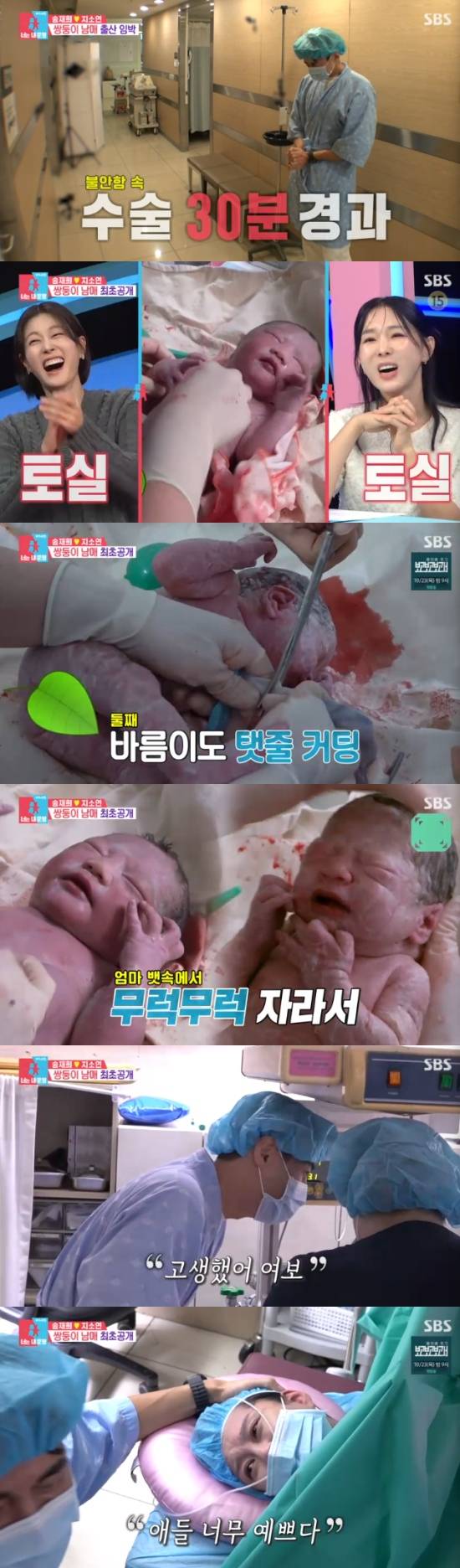 긴장이 풀린 송재희는 오열하면서 쌍둥이 탯줄을 직접 잘랐다. 특히 첫째는 쌍둥이임에도 3.25kg으로 우량하게 태어나 미소를 유발했다.