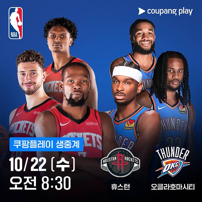 NBA 2025-26 정규시즌은 오는 22일 오전 8시 30분(한국 시간), 케빈 듀란트가 이끄는 휴스턴 로키츠와 지난 시즌 챔피언 오클라호마시티 썬더의 맞대결로 개막한다. 쿠팡플레이는 개막 후 2주 동안 40경기를 한국어 해설로 중계하고, 이후에도 매주 평균 20경기를 제공할 예정이다. 경기 전후에는 프리뷰-리뷰 콘텐츠도 함께 선보일 계획이다.