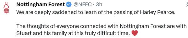 한편, 노팅엄 구단은 '할리 피어스의 부고에 깊은 슬픔을 느낀다. 노팅엄과 관련된 모든 분들이 이 어려운 시기에 피어스와 그의 가족에게 깊은 애도를 표한다'라고 밝혔다.