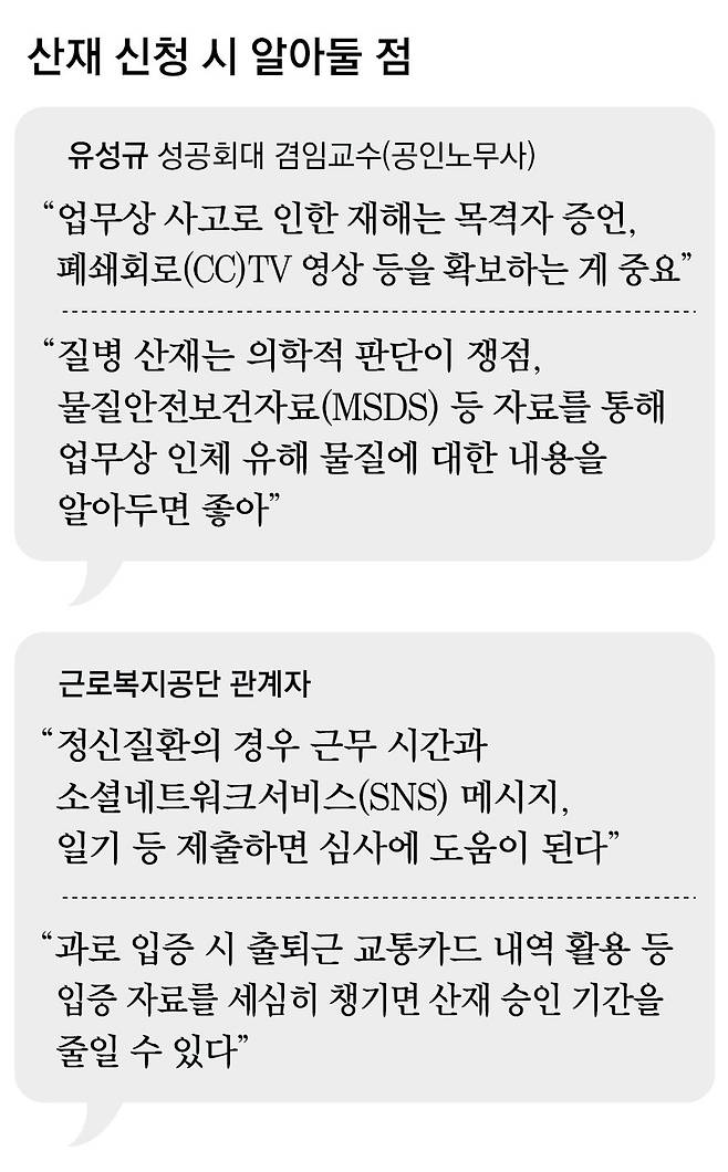 공단 관계자는 “정신질환의 경우 근무시간 소셜네트워크서비스(SNS) 메시지, 일기 등을 제출하면 심사에 도움이 된다”며 “과로를 입증할 때는 출퇴근 교통카드 내역을 활용하는 등 세심히 챙기면 산재 승인 기간을 줄일 수 있다”고 말했다.