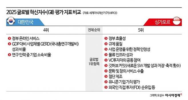 세계지식재산기구(WIPO)가 발표한 '2025 글로벌 혁신지수(GII)'에서 싱가포르는 정부 효율성, 규제 품질, 정책 안정성 등 10개 세부 부문 1위를 차지했다. 싱가포르는 스위스·스웨덴·미국을 제치고 가장 많은 1위 항목을 기록했다. 한국이 '국내총생산(GDP) 대비 기업 연구개발(R&D) 지출 비율' 등 민간 중심 지표에서 강세라면, 싱가포르는 '정부 효율성' '규제 품질' '외국인직접투자(FDI) 순유입' 등 정부 주도형 지표에서 두각을 나타냈다.