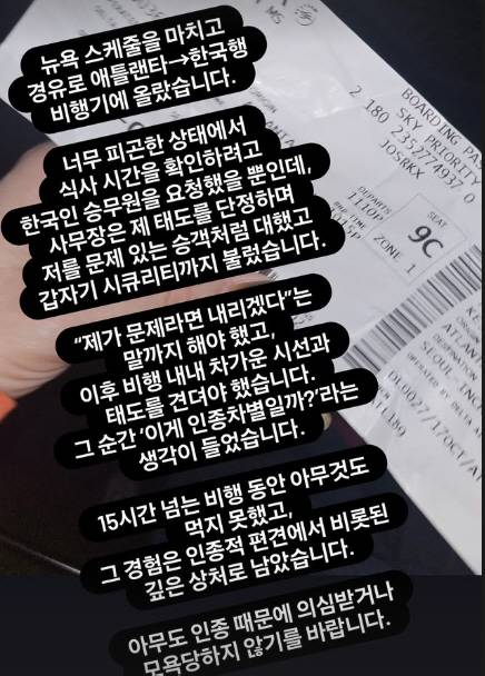 이어 "수면 시간이나 컨디션 조절 등을 위해 매번 비행기 탑승 후 식사 스케줄을 확인하고 있다. 한국행 비행기이기에 한국어가 가능한 승무원이 있을 거라 생각했고 이를 요청하는 과정에서 제 영어 문장이 오역돼 잘못된 내용으로 전달됐는지 사무장과 보안요원이 왔다. 이때 한국어가 가능한 승무원도 오셔서 대화를 도와주셨는데 저는 전혀 문제없음이 확인됐고 비행기에 탑승한 채 예정대로 입국했다"고 설명했다.