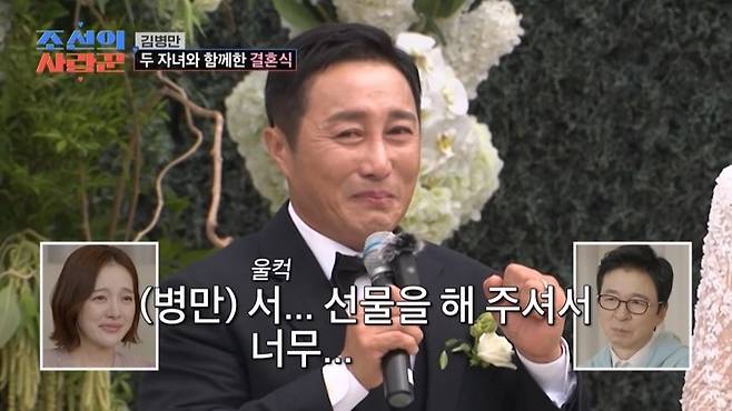 김병만은 "우리 아내를 잘 키워주셔서 감사하다. 이런 선물을 주셔서"라고 운을 뗐지만, 솟구치는 여러 감정에 말을 잇지 못했다. 하객들도 눈시울을 붉힌 가운데, 지켜보던 사랑꾼 MC들도 눈물을 흘렸다.