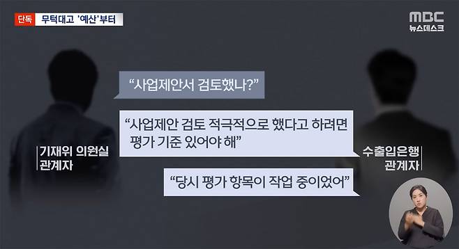 수출입은행은 MBC 취재진에게 사업제안서를 검토하지 않았다고 밝혔습니다. "사업제안서 검토는 예산편성 전에 거쳐야 할 절차가 아닌 것으로 판단했다"라는 게 그 이유였습니다. 그리고 "향후 평가매뉴얼을 수립하면 그에 따라 별도로 평가할 계획이었다"고 덧붙였습니다. 아울러 "시중은행 참여의향서, 참여의향서 제출 현지법인에 대한 신용평가, 일본 등 타 기관의 지원규모 등을 바탕으로 예산을 신청했다"고도 설명했는데요.