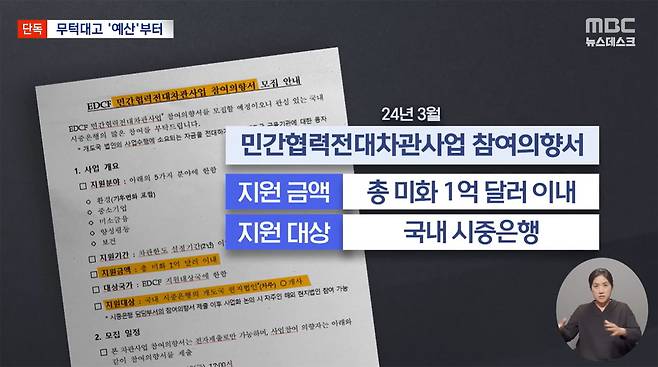 '어떻게 검토 없는 예산 편성이 정상 절차가 될 수 있지?'라는 의문은 잠시 제쳐놓겠습니다. 이들이 근거로 삼는 은행들의 참여의향서조차 대단히 구체적이지는 않았는데요. MBC는 각 시중은행들이 수출입은행에 제출한 참여의향서를 입수해서 살펴봤습니다. 이 문서로 1억 달러, 당시 환율로 1천3백억 원 상당의 사업을 신청한 건데, 개괄적인 내용이 대부분이었고 그나마도 3페이지를 채 넘기지 않는 분량이었습니다.