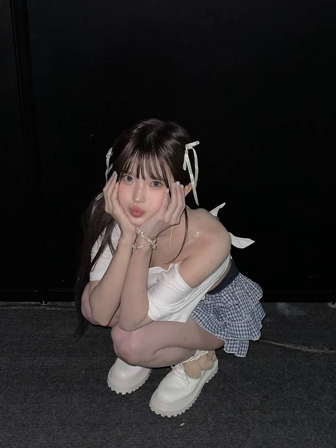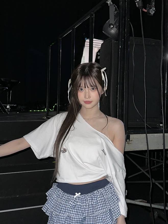 공개된 사진 속 송하영은 어깨 라인이 드러나는 오프숄더 화이트 톱에 체크 패턴의 프릴 미니스커트를 매치해 사랑스러운 무드를 연출했다.