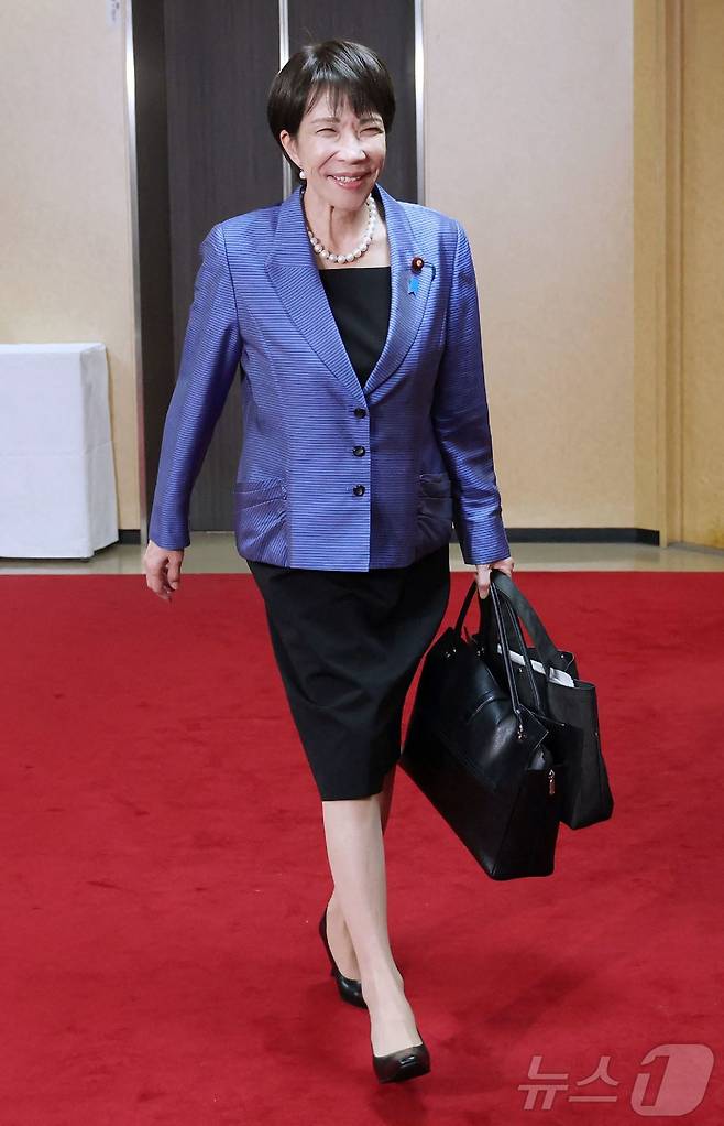 (도쿄 AFP=뉴스1) 최종일 선임기자 = 일본 집권 여당 자민당의 다카이치 사나에 총재가 21일 도쿄 자민당 본부로 당 집행부 회의에 참석하기 위해 입장하고 있다. 2025.10.21