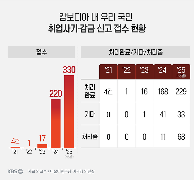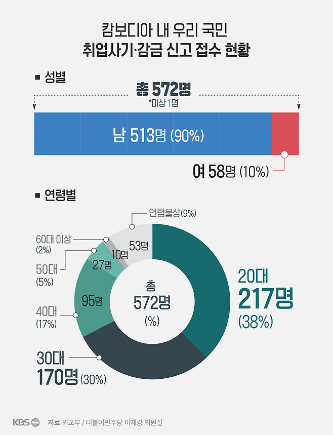 2021년부터 2025년 8월까지 캄보디아에서 접수된 우리 국민 취업사기·감금 신고 사례 527명 중 387명이 20~30대였습니다. 전체의 68%입니다.