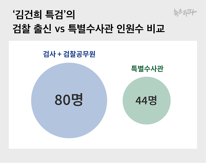 우선 구성원의 숫자 자체가 그렇습니다. 파견 검사는 40명입니다. 당초 특검법이 정해놓은 상한을 꽉 채워 뽑았습니다. 여기에 검사를 제외한 파견 공무원 80여 명 중 40명 가량이 검찰에서 온 이들입니다. 그러니까 검찰 출신이 모두 80명 정도인 셈이죠. 반면 특검법이 80명까지 뽑을 수 있도록 해놓은 특별수사관은 단 44명만 뽑았습니다.