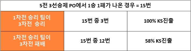 역대 5전 3선승제 플레이오프에서 1승 1패로 맞선 뒤 3차전 승리 팀이 한국시리즈에 진출할 확률은 고작 53.3%밖에 안됐다.