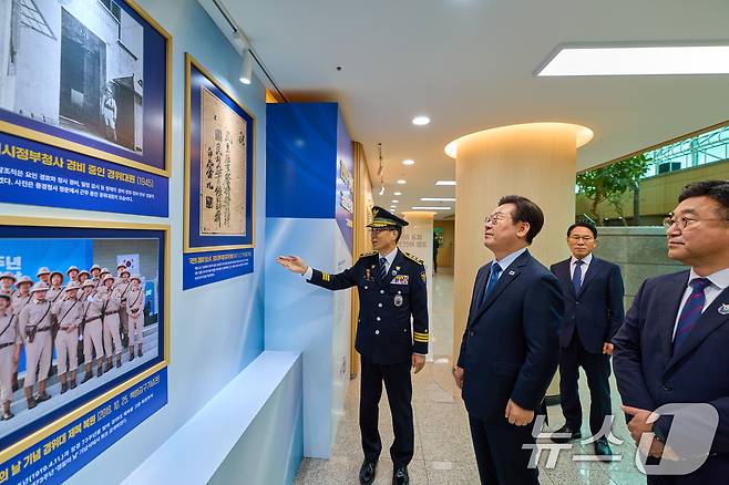 (서울=뉴스1) 허경 기자 = 이재명 대통령이 21일 서울 서대문구 경찰청에서 열린 제80주년 경찰의 날 기념식에 참석해 초대 경무국장 김구의 휘호를 보고 있다. (대통령실 제공. 재판매 및 DB 금지) 2025.10.21/뉴스1