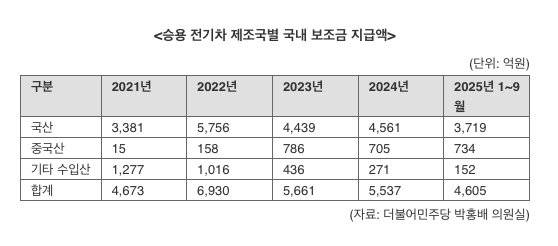 21일 국회 기후에너지환경노동위원회 소속 더불어민주당 박홍배 의원이 기후에너지환경부로부터 제출 받은 자료에 따르면 2021년부터 올해 9월까지 4년 9개월간 중국산 승용 전기차에는 총 2398억원의 보조금이 지급된 것으로 확인됐다.