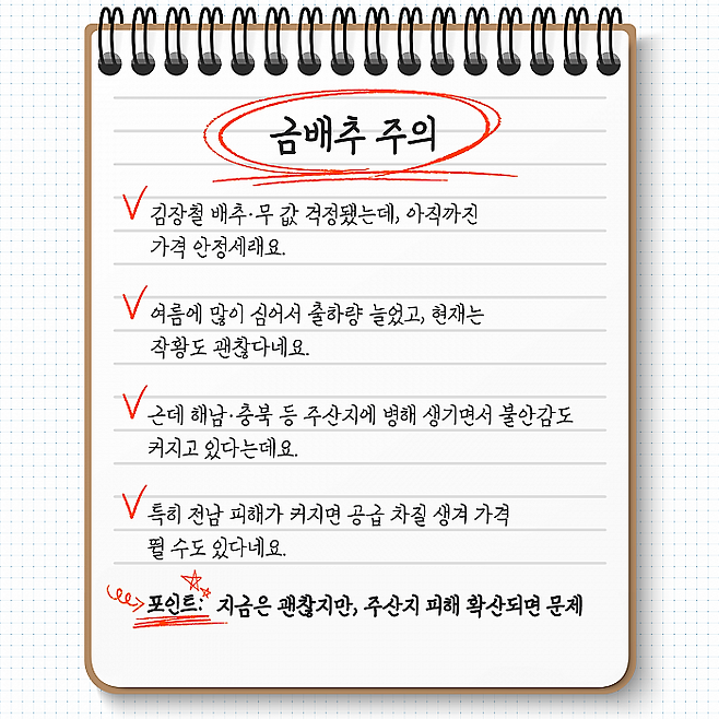 ✅ 포인트: 지금은 괜찮지만, 주산지 피해 확산되면 문제 생길 수도 있어요.