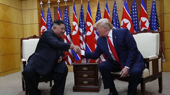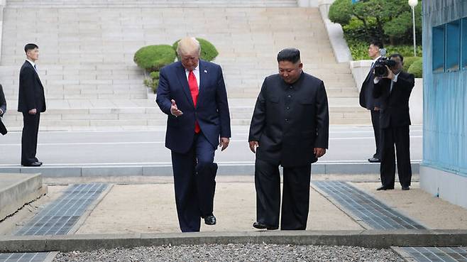 트럼프 대통령과 김정은 국무위원장은 지난 2019년 6월 30일 판문점에서 만났습니다. 일본 G20 정상회의를 마치고 방한하던 트럼프 대통령이 하루 전 29일 오전 8시쯤 자신의 트윗에 "김정은 위원장이 이 글을 본다면 방한 기간 중 DMZ에서 만나 악수하고 인사하고 싶다"고 밝혔고, 북한이 5시간 만에 "정상 간 상봉이 성사된다면 또 하나의 의미 있는 계기가 될 것"이라고 외무성 담화로 답하면서 성사됐습니다. 두 사람은 30일 오후 남북 군사분계선을 오가며 앞선 싱가포르-하노이 정상회담보다도 길게, 55분 간 회동했습니다.