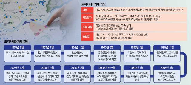 21일 학계에 따르면 토지거래허가제는 1978년 최초 도입 이후 여러 정부에서 투기 억제수단으로 활용했는데 주택시장 안정과 관련해선 유의미한 효과를 내지 못한 것으로 조사됐다. 토허구역은 1970년대 경부고속도로 개통 등 각종 개발이 성행하면서 땅 투기를 막기 위한 목적에서 최초로 제도화됐다. 이후 1985년 대전 대덕연구단지 개발과 관련 투기 조짐이 발생하자 29㎢의 토지를 거래허가구역으로 묶으며 처음 시행됐다. 김영삼 정부 당시인 1993년에는 금융실명제 부작용을 우려해 전 국토의 93.8%를 토허구역으로 지정하며 강력한 규제로 작동했다. 하지만 1997년 외환위기 발생으로 건설경기 등이 심각하게 침체하자 이듬해 4월 전국의 토허구역을 모두 해제했다.