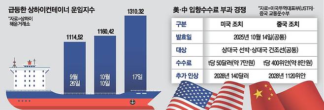 미국과 중국이 서로의 선박에 입항수수료를 부과하면서 글로벌 해운시장이 크게 흔들리고 있다. 주요 항로 운임은 일주일 만에 10% 넘게 급등했고 선사들은 항로를 바꾸는 등 혼란이 가중되고 있다. 기업들의 물류비 부담도 빠르게 높아지고 있다.
