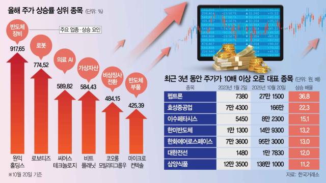 올해 주목을 받고 있는 로봇 업종 가운데 가장 뜨거운 종목인 로보티즈도 텐베거다. 로보티즈 주가는 지난해 10월 1만 7000원 수준에서 이달 19만 8000원까지 10배 이상 올랐다. 마스가(MASGA·미국 조선업을 다시 위대하게) 대표 수혜주로 꼽히는 HJ중공업 역시 지난해 10월 주당 2500원이던 주가가 이달 2만 8000원을 넘어섰다. 이 외에도 의료 AI 기업인 씨어스테크놀로지(589.82%), 가상자산 관련 사업을 추진 중인 비트플래닛(584.43%), 반도체 부품 업체인 마이크로컨텍솔(425.39%) 등도 텐베거 유력 후보로 꼽힌다.